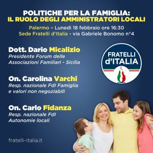 Lunedì 18 febbraio a Palermo, alle ore 16: 30, presso la segreteria di Fratelli d’Italia (via Bonomo,4), incontro sulle politiche per la famiglia e il ruolo degli amministratori locali.