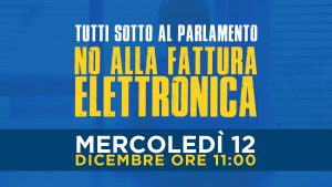 Mercoledì 12 dicembre, alle ore 12:00, manifesteremo in piazza Montecitorio insieme ad artigiani, professionisti, imprenditori e commercianti per chiedere al Governo che la fatturazione elettronica sia obbligatoria solo per le prestazioni di importo superiore a 10.000 € e che sia posticipata per le piccole imprese al 2022.